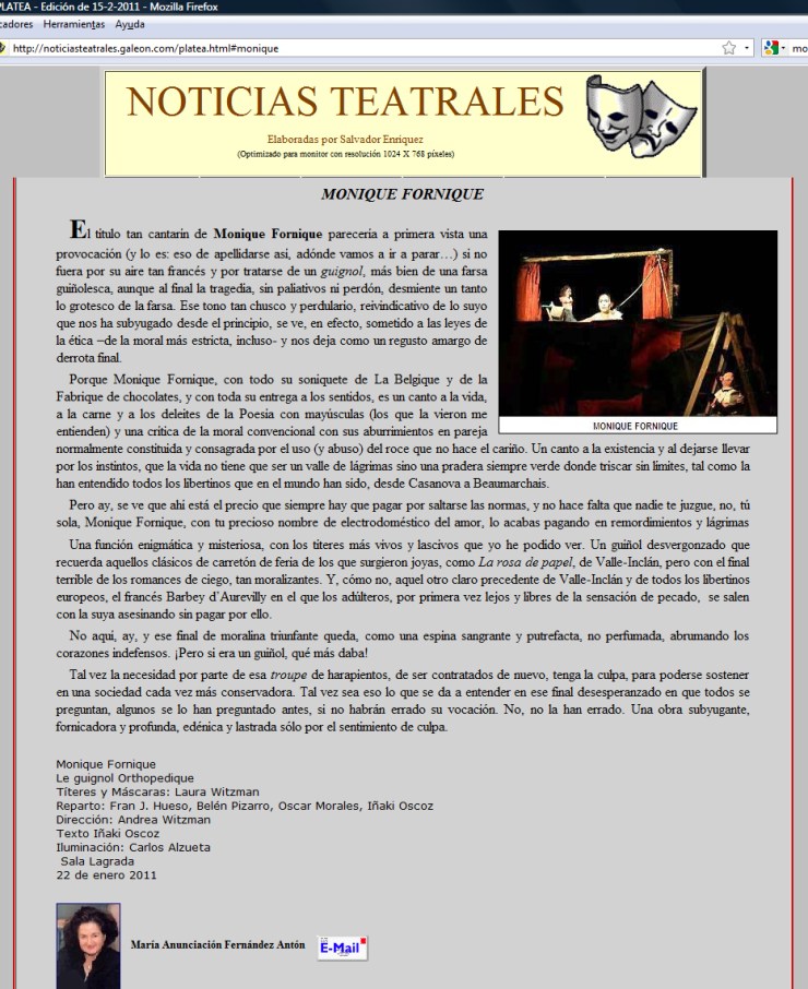 Como por ahora no nos han tirado zapatos a escena, ni siquiera algún tomate empodrido con el que facernos una ensalada, vamos a aprovechar para presentar en mesa, a modo de grasienta y placentera ración, un par de críticas de nuestro empectáculo Monique Fornique.