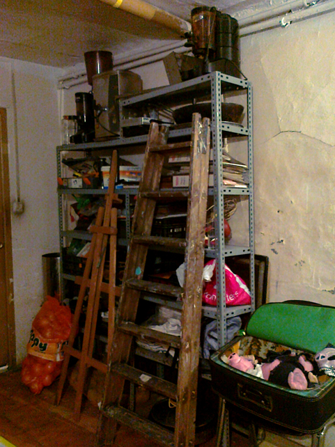 Los muñecos comparten felizmente lugar de pernocta con cebollas, viejas cafeteras arrumbadas y otros enseres.